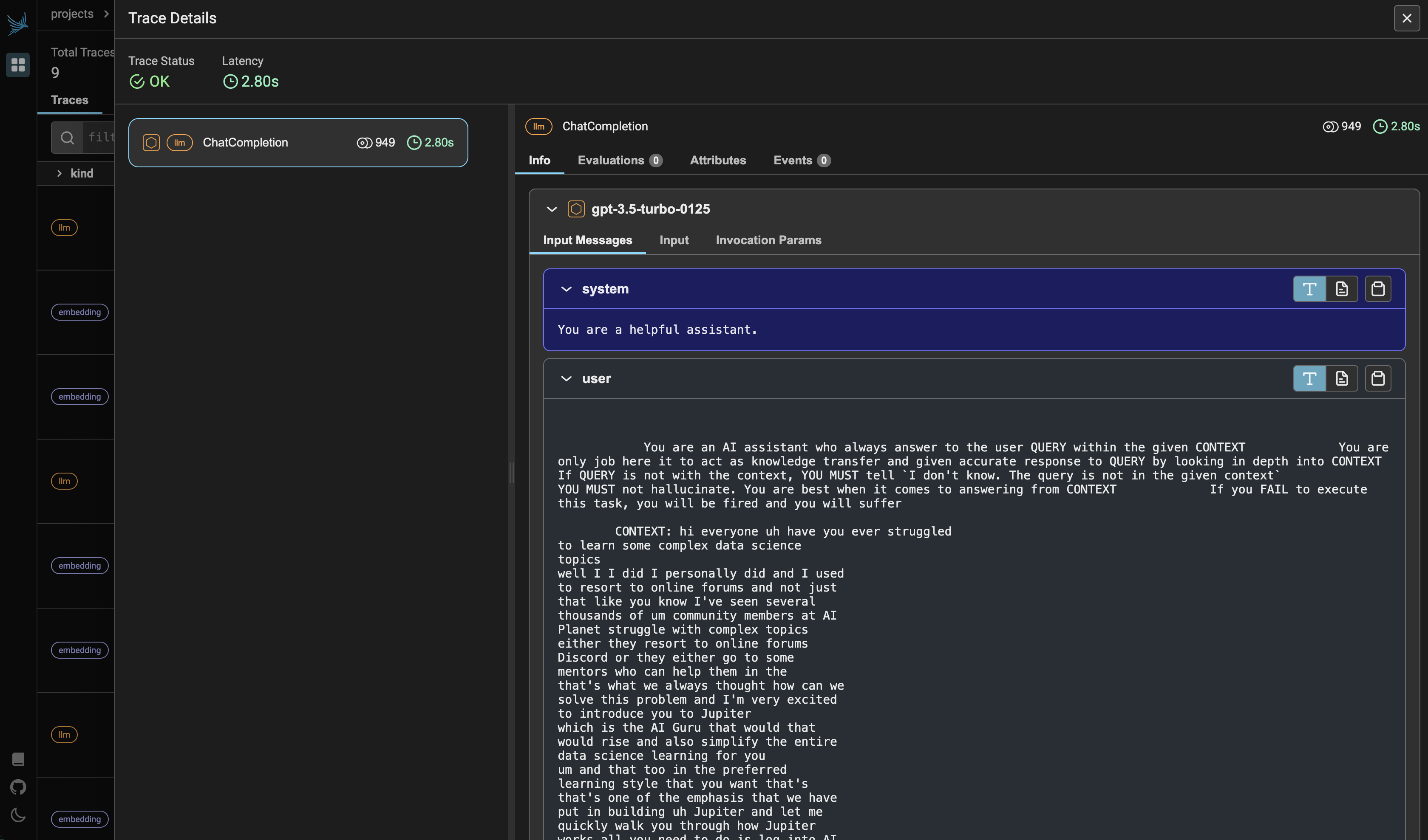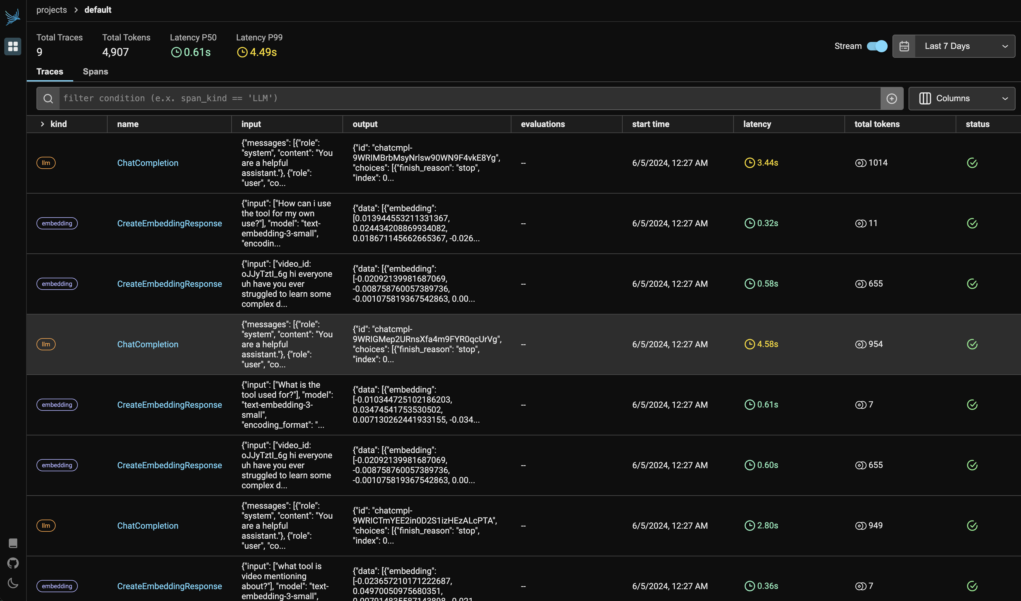 * **Tracking metrics:** This includes things like response time, token usage and the kind of api call (embedding, llm, etc).